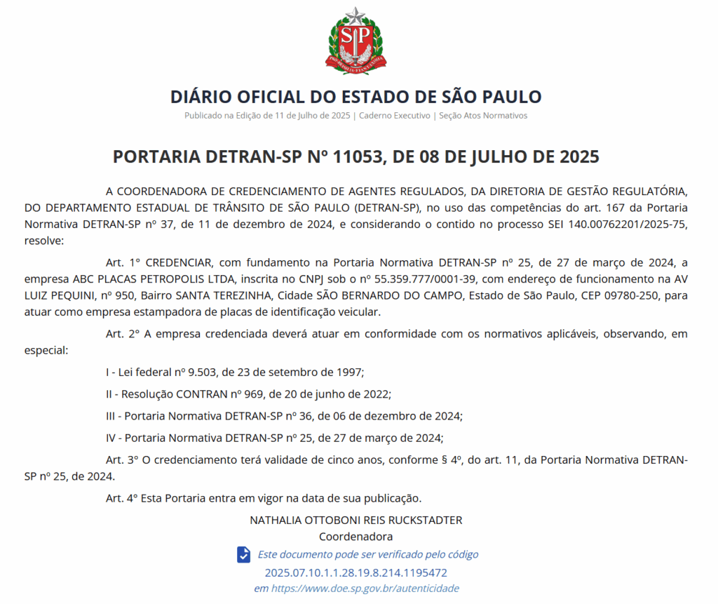 Autorização: Portaria Detran/SP nº 11.053, de 08 de julho de 2025 – Empresa autorizada a atuar como estampadora de placas de identificação veicular.